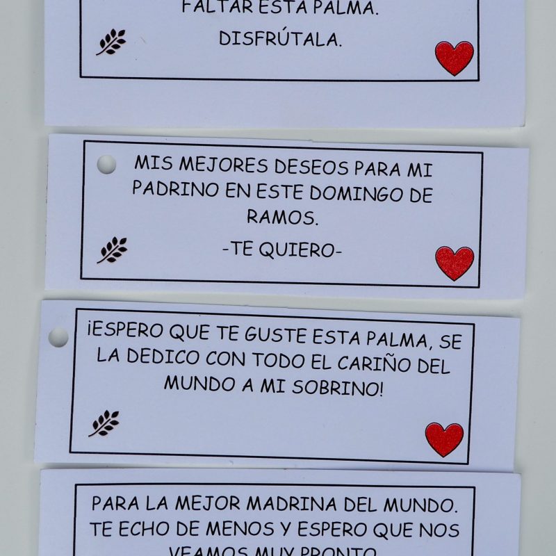 - Tarjeta de carton reciclado color blanco de 12x6cm en la que podrás escribir lo que desees y dedicar esa palma personalizando al máximo tu regalo.¡Ahora la impresión y el texto lo hacemos mediante ordenador! El espacio de la tarjeta es limitado (12x6cm),por lo tanto lo que escribas debe ajustarse a esas medidas.