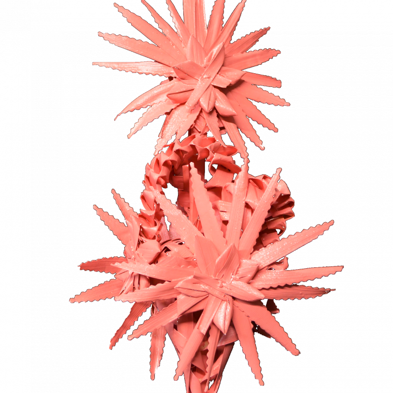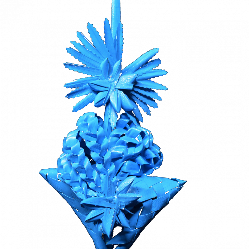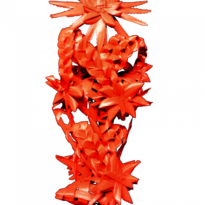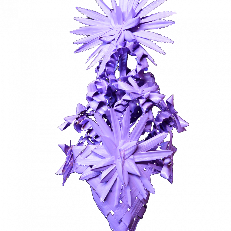 Palma trenzada de color para en Domingo de Ramos de 60-55 cm. Dichas palmas son secadas durante varios meses y pintadas con posterioridad adquiriendo un color y textura muy atractivo.