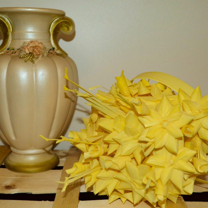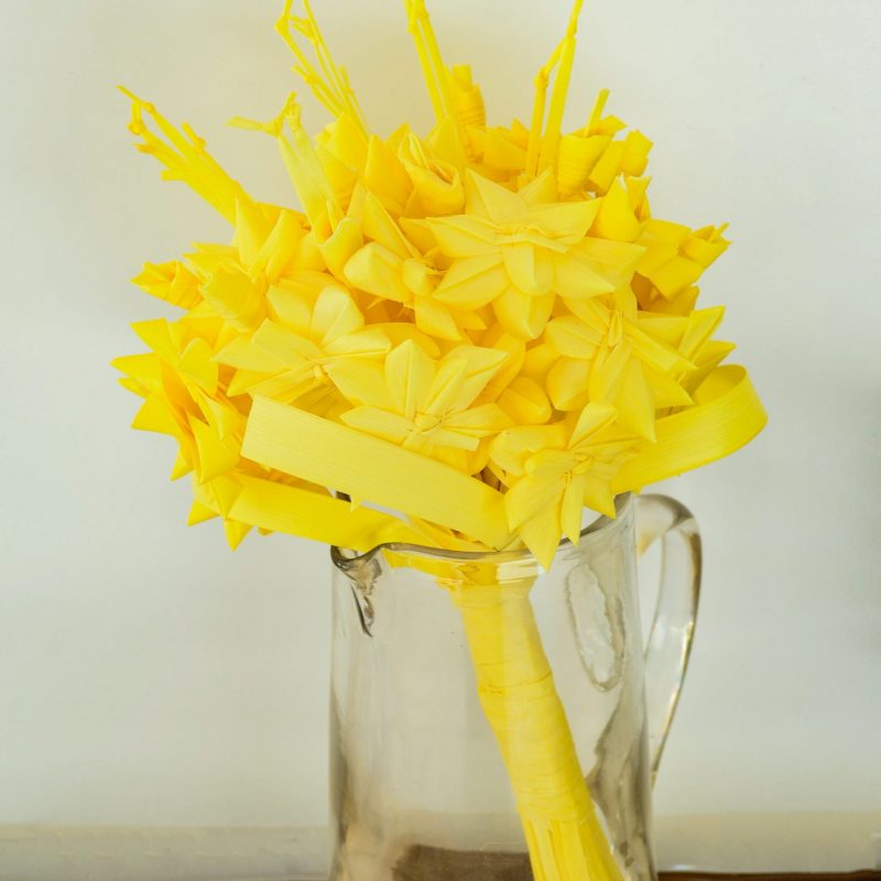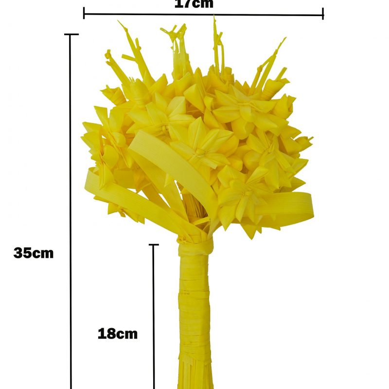 Ramo de novia para boda elaborado en su totalidad con palma blanca para el Domingo de Ramos. Mide unos 35 centímetros de largo,está compuesto por rosas,pingajos y nuditos en la parte superior dándole volumen. Peso aproximado unos 600 gramos,es cómodo de llevar en la mano y agradable al tacto. Está hecho de tal manera para que se quede compacto y no se deshaga facilmente,se puede agitar sin miedo y no se romperá. Dale un toque exclusivo y diferente a tu boda y será única! También puedes decorar algún centro de mesa o jarrón con el ramo,quedará precioso.